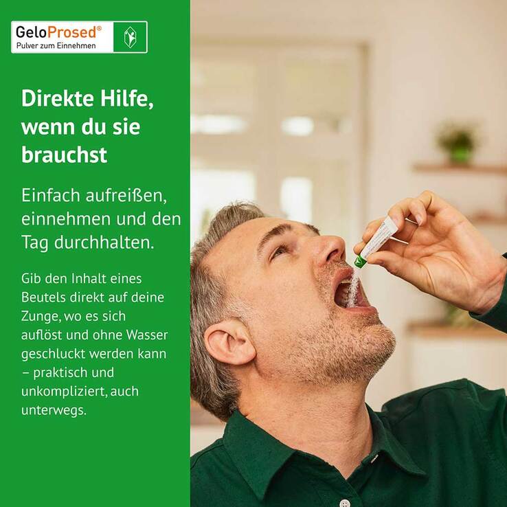 Das Besondere an GeloProsed®: Es steht als Direktpulver in praktischen Aufreißbeuteln zur Verfügung. Das Pulver löst sich ohne Wasser direkt im Mund auf. So können Sie GeloProsed® ganz unkompliziert einnehmen, auch wenn Sie unterwegs sind.
