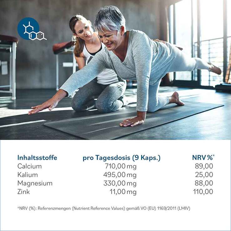 * Calcium wird für die Erhaltung normaler Knochen benötigt, Calcium trägt zu einer normalen Muskelfunktion bei, Calcium trägt zu einer normalen Signalübertragung zwischen den Nervenzellen bei, Calcium wird für die Erhaltung normaler Zähne benötigt, Kalium trägt zu einer normalen Muskelfunktion bei, Kalium trägt zu einer normalen Funktion des Nervensystems bei, Magnesium trägt zur Erhaltung normaler Knochen bei, Magnesium trägt zu einer normalen Muskelfunktion bei, Magnesium trägt zu einer normalen Funktion des Nervensystems bei, Magnesium trägt zur Erhaltung normaler Zähne bei, Zink trägt zur Erhaltung normaler Knochen bei, Zink trägt zu einer normalen kognitiven Funktion bei.
