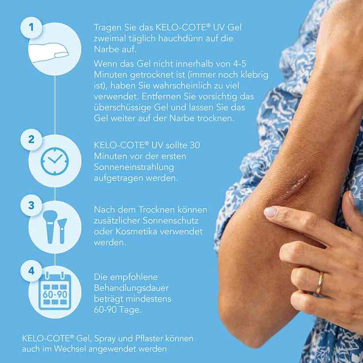Tragen Sie KELO-COTE® Narbengel UV zweimal täglich hauchdünn auf die betroffene Hautpartie auf und lassen Sie das Gel trocknen. Wenn KELO-COTE® Narbengel UV nicht innerhalb von 3-4 Minuten getrocknet ist, haben Sie wahrscheinlich zu viel Narbengel UV verwendet. Entfernen Sie das überschüssige Gel vorsichtig und lassen Sie die Hautpartie dann weiter abtrocknen.