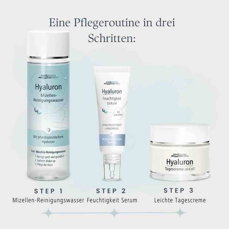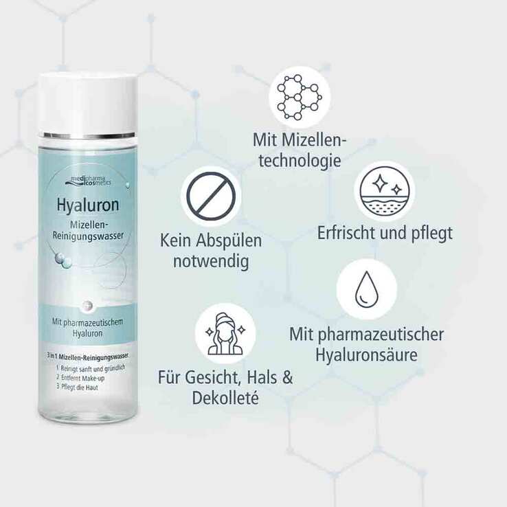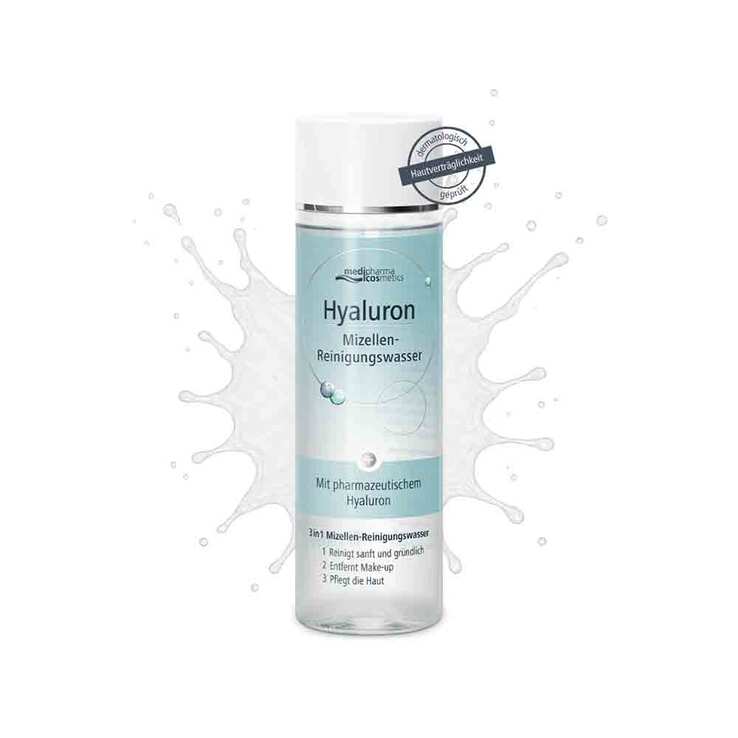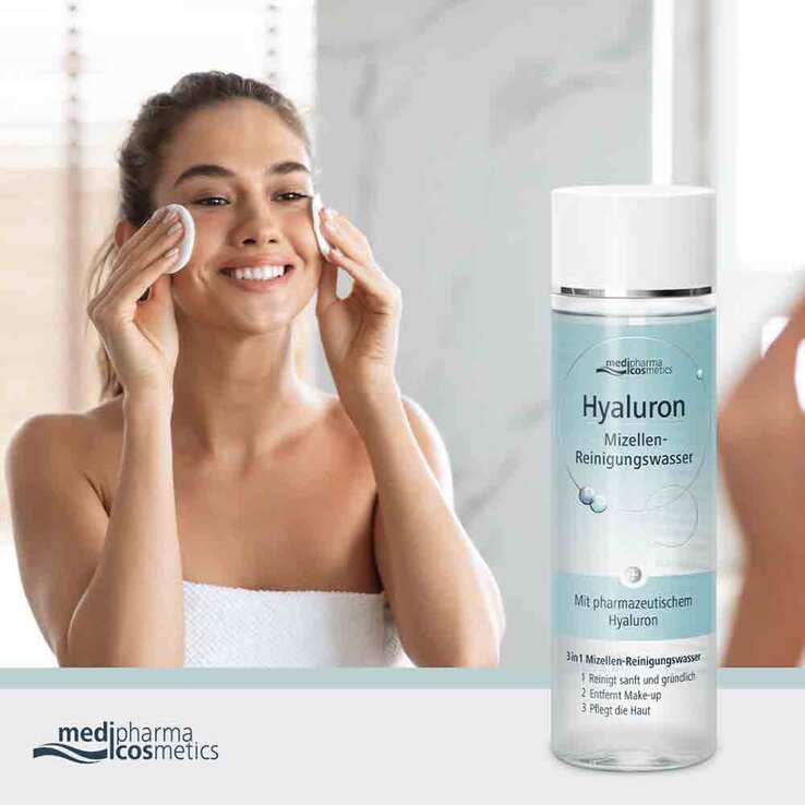 Das Hyaluron Mizellen-Reinigungswasser von medipharma cosmetics ist ein Allrounder für die tägliche Gesichtspflege. Es reinigt, entfernt Make-up und pflegt die Haut – in nur einem Schritt, ganz ohne Abspülen