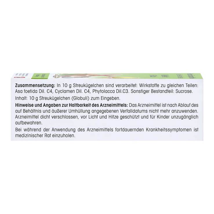 Die Streukügelchen enthalten zu gleichen Teilen: Asa foetida C4, Cyclamen C4, Phytolacca C3