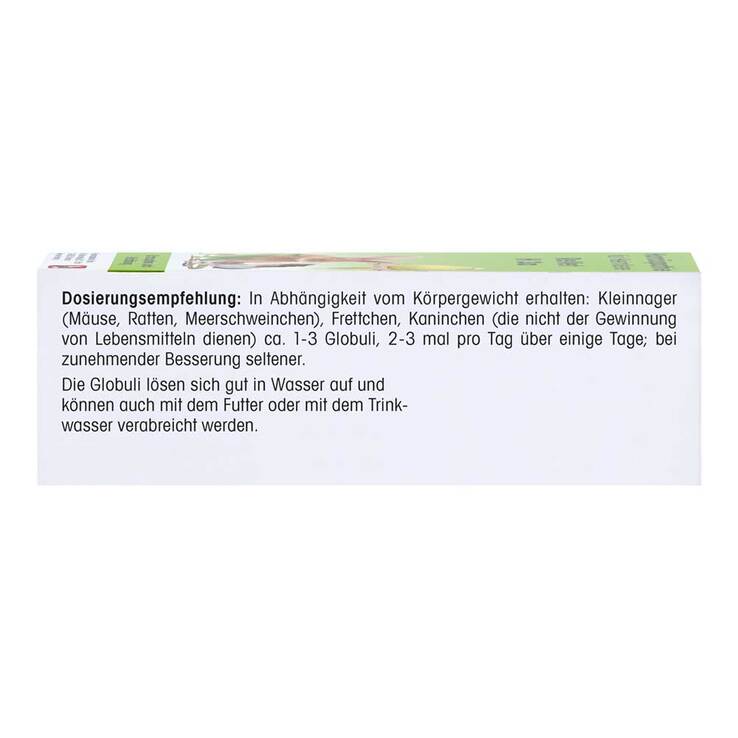In Abhängigkeit vom Körpergewicht erhalten: Kleinnager (Mäuse, Ratten, Meerschweinchen), Zier- und Singvögel, Terrarientiere, Brieftauben, Frettchen, Kaninchen (die nicht der Gewinnung von Lebensmitteln dienen) ca. 1 bis 3 Globuli, 2- bis 3-mal pro Tag über einige Tage; bei zunehmender Besserung seltener.