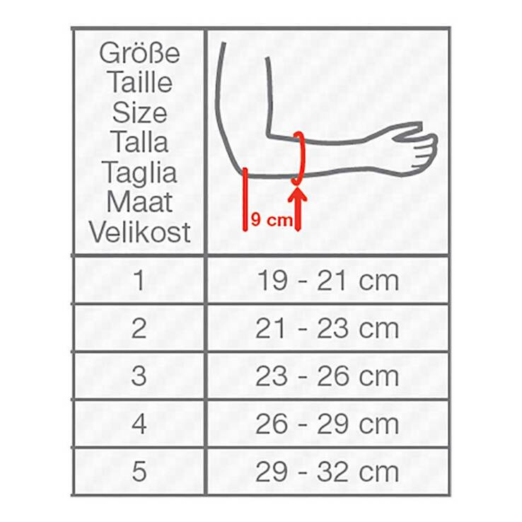 | Größe | Armumfang (9 cm von Ellenbogen nach distal) (cm) |