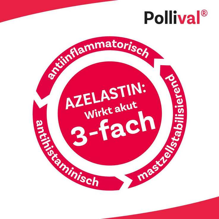 Der Wirkstoff Azelastin in den Pollival® Augentropfen ist ein Antihistaminikum der 2. Generation. Er zeichnet sich durch eine kombinierte Wirkung aus: Zum einen stabilisiert er die histaminausschüttenden Mastzellen und schwächt so die allergische Reaktion beim Kontakt mit allergenen Substanzen ab. Zum anderen blockiert er das Andocken des Botenstoffs Histamin an spezifische Rezeptoren, indem Azelastin selbst die Bindungsstellen der H-Rezeptoren besetzt. In dem Azelastin selbst die Bindungsstellen der H-Rezeptoren. Allergische und entzündliche Reaktionen wie juckende und tränende Augen können so innerhalb weniger Minuten bei nur 2-mal täglicher Anwendung verhindert oder wesentlich gemindert werden.