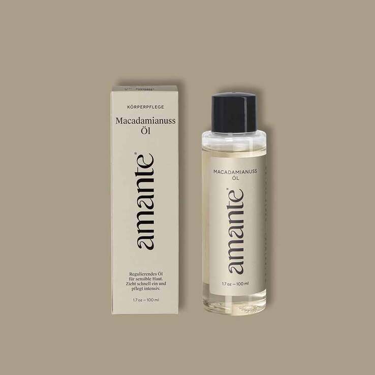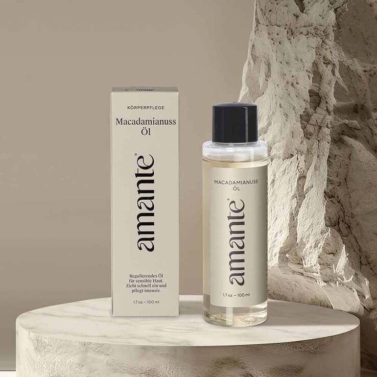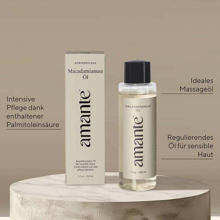 Amante Macadamianussöl ist ein gut geeignetes Massageöl, das regulierend und rückfettend ist. Es ist besonders effektiv bei trockener, reifer und strapazierter Haut. Dank enthaltener Palmitoleinsäure pflegt es auch empfindliche Haut sanft und intensiv.