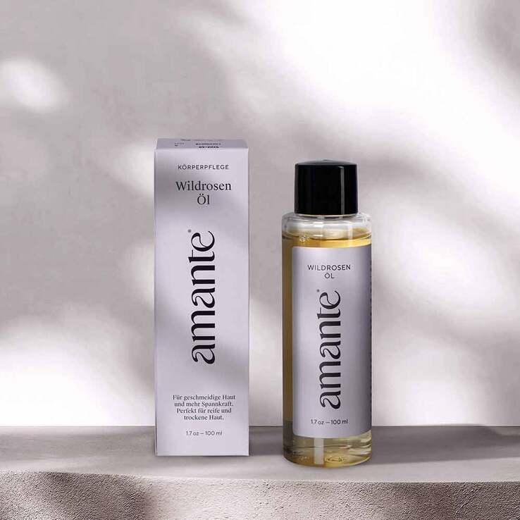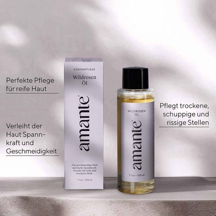 Amante Wildrosenöl eignet sich ideal für die Gesichtspflege reifer und trockener Haut. Als Körperpflegeöl verleiht es Spannkraft und Geschmeidigkeit. Reich an natürlichen Antioxidantien pflegt es zuverlässig trockene, schuppige und rissige Stellen.