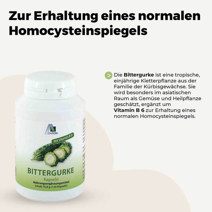 Nahrungsergänzungsmittel mit dem Frucht-Extrakt der Bittergurke (Momordica Charantia) und Vitamin B6 zur Erhaltung eines normalen Homocysteinspiegels.