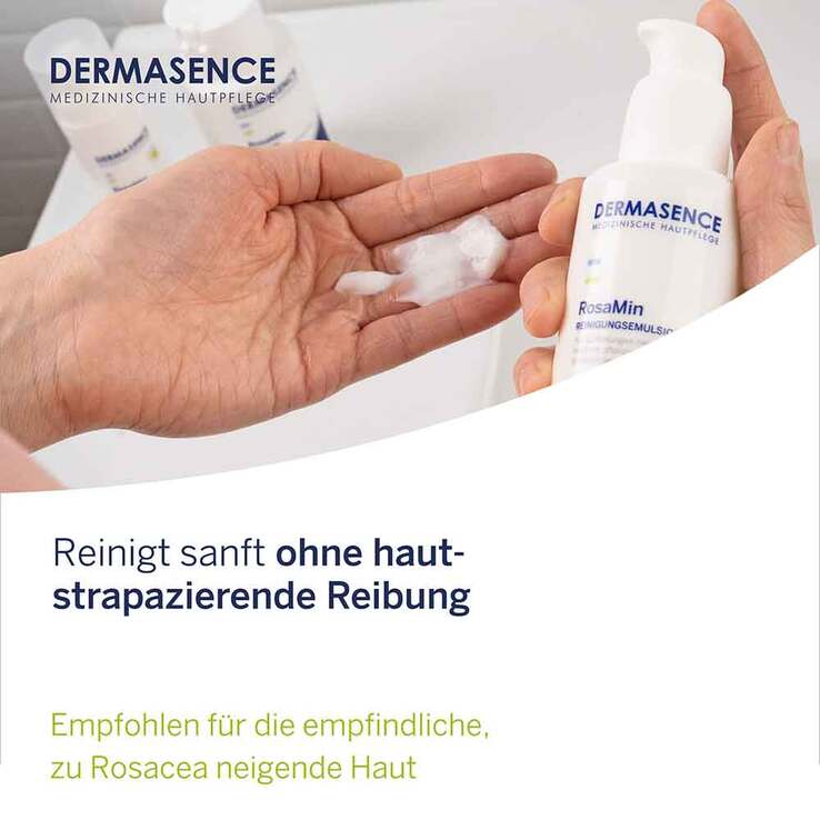 Die Dermasence RosaMin Reinigungsemulsion ist eine milde, parfümfreie Reinigungsemulsion mit 5-fach-Wirkkomplex für die empfindliche, zu Rosacea neigende Haut. Sie sorgt für eine sanfte Reinigung ohne hautstrapazierende Reibung.