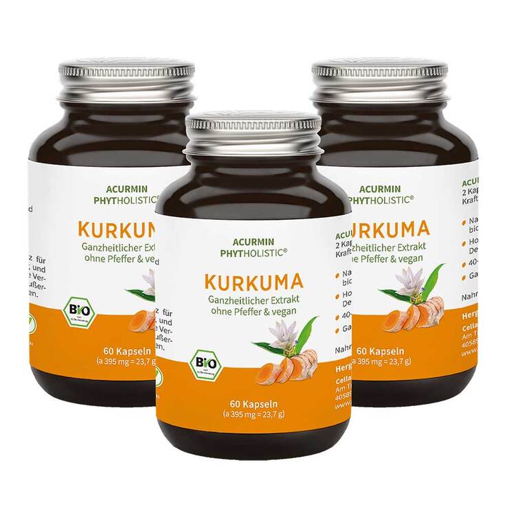 Acurmin Phytholistic setzt neue Standards bei hochkonzentrierten Vollspektrum-Bio-Kurkuma-Produkten. Es bietet mehr als 200 bioaktive Inhaltsstoffe. Jede Tagesdosis enthält 300 mg Curcuminoide und 255 mg Curcumin, was einem Gehalt von bis zu 15.000 mg reinem Kurkuma-Pulver entspricht.