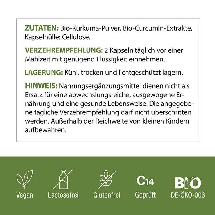 Durch das spezielle 3-Stufen-Extraktionsverfahren bleibt der gesamte Inhaltsstoffkomplex des Bio-Kurkumapulvers erhalten, um höchste Qualität zu garantieren. Jede Charge wird C14-zertifiziert, um Ihnen maximale Sicherheit zu gewährleisten. Hergestellt nach pharmazeutischen Standards in Deutschland.