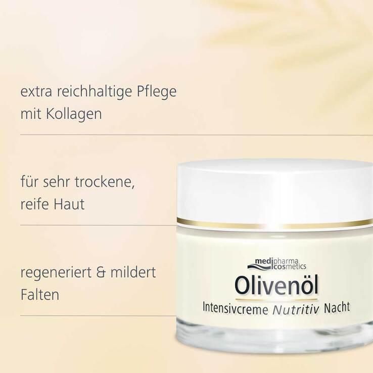 Die Olivenöl Intensivcreme Nutritiv Nachtcreme wurde speziell für die intensive Pflege sehr trockener, reifer Haut entwickelt. Während der Nacht, wenn die Haut in ihrer nächtlichen Regenerationsphase ist, unterstützt die reichhaltige Formel mit kaltgepresstem Olivenöl, Olivenbutter, Vitamin A und Kollagen die Zellerneuerung der Haut. Sie fördert die Regeneration, mildert Falten und versorgt die Haut mit einer angenehmen Pflegeformel.