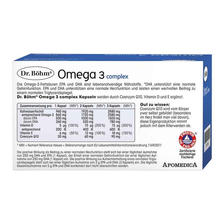 Dr. Böhm Omega 3 complex Kapseln enthalten 870 mg Omega-3-Fettsäuren entsprechend 750 mg EPA und DHA aus hochwertigem, schadstoffgeprüftem Kaltwasserfischöl pro Kapsel. EPA und DHA leisten einen Beitrag zu einem normalen Triglyceridspiegel sowie einer normalen Herzfunktion. DHA unterstützt eine normale Gehirnfunktion. Die Innovation der magensaftstabilen Kapseln: Sie sorgen dafür, dass die Omega-3-Fettsäuren geruchs- und geschmacksfrei erst im Darm freigesetzt werden.