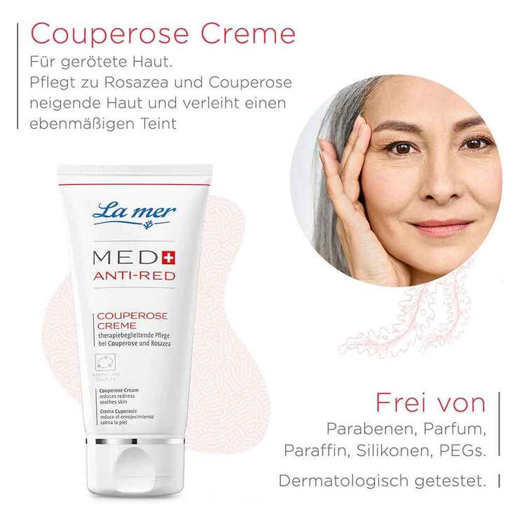 In Med+ Anti-Red wirkt der Marine Care Complex aus Meeresschlick-Extrakt, Grünalgenextrakt und Meersalz mit zusätzlichen Wirkstoffen für spezifische Bedürfnisse gereizter Haut mit vorübergehender oder dauerhafter Rötung. Die La mer Med+ Anti-Red Produkte bieten dank der Kraft des Meeres therapiebegleitende Pflege bei zu Couperose und zu Rosazea neigender Haut. So werden Hautirritationen gemildert und Rötungen kaschiert.