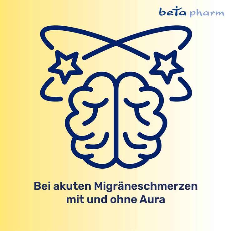 Naratriptan beta bei Migräne 2,5 mg Filmtabletten. Anw.: Akute Behandlung der Kopfschmerzphase von Migräneattacken mit oder ohne Aura bei Pat. im Alter zwischen 18 u. 65 Jahren. Warnh.: Enth. Lactose. Nehmen Sie dieses Arzneimittel erst nach Rücksprache mit Ihrem Arzt ein, wenn Ihnen bekannt ist, dass Sie unter einer Unverträglichkeit gegenüber bestimmten Zuckern leiden. Zu Risiken und Nebenwirkungen lesen Sie die Packungsbeilage und fragen Sie Ihre Ärztin, Ihren Arzt oder in Ihrer Apotheke. betapharm Arzneimittel GmbH, 86156 Augsburg. www.betapharm.de. GI 11/20