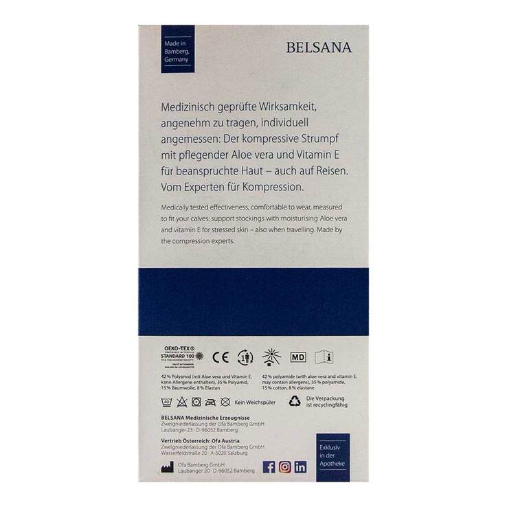 Mit den Reisestrümpfen BELSANA medical aloe vera sagen Sie geschwollenen Füßen und Beinen Lebewohl. Das kommt Ihnen besonders dann zugute, wenn Sie viel unterwegs sind. Gleichzeitig schützen die kompressiven Kniestrümpfe vor Krampfadern als auch Besenreisern und wirken zudem vorbeugend gegen (Reise-)Thrombose.