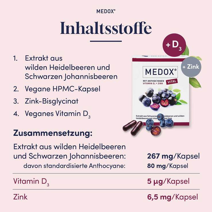 Extrakt aus wilden, skandinavischen Heidelbeeren (Vaccinium myrtillus) und Schwarzen Johannisbeeren (Ribes nigrum), Maltodextrin, pflanzliche Kapselhülle: Hydroxypropylmethylcellulose, Zink-Bisglycinat, veganes Vitamin D3 (Cholecalciferol).