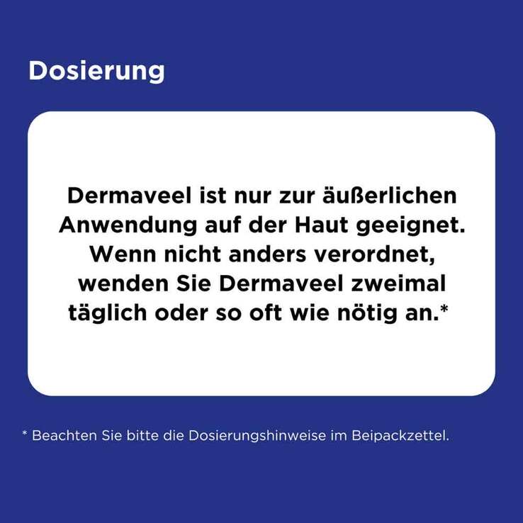 Dermaveel® kann zweimal täglich und bei Bedarf so so oft wie notwendig auf die betroffene Haut aufgetragen und sanft einmassiert.