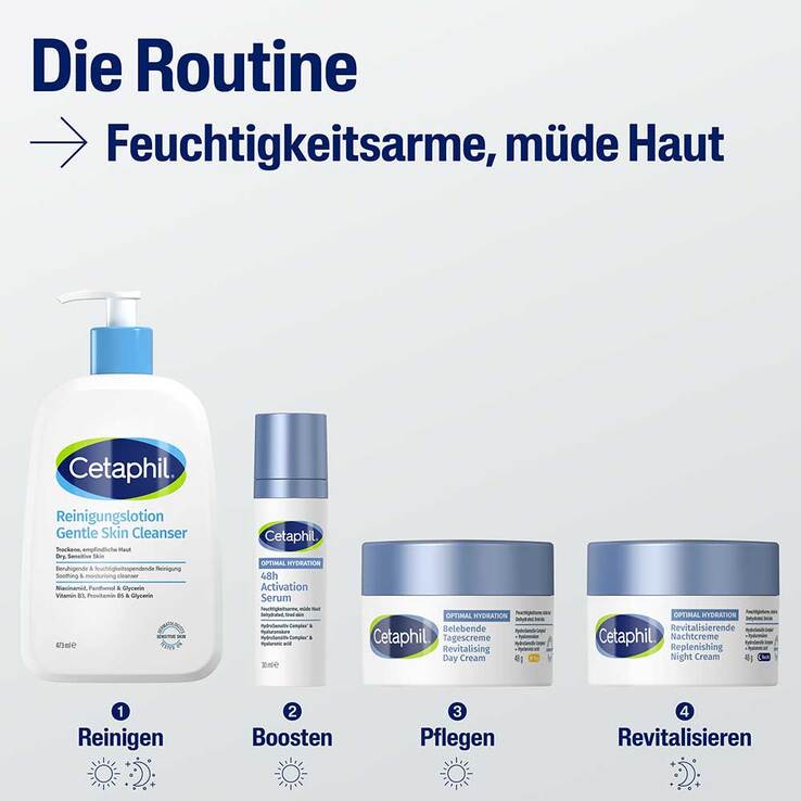 Das Cetaphil Optimal Hydration belebende Feuchtigkeitscreme ist Teil der Cetaphil Optimal Hydration Serie für feuchtigkeitsarme, müde wirkende Haut. Diese bietet ein ganzheitliches und aufeinander abgestimmtes Pflegekonzept für klinisch erprobte 48h-Hydratisierung.