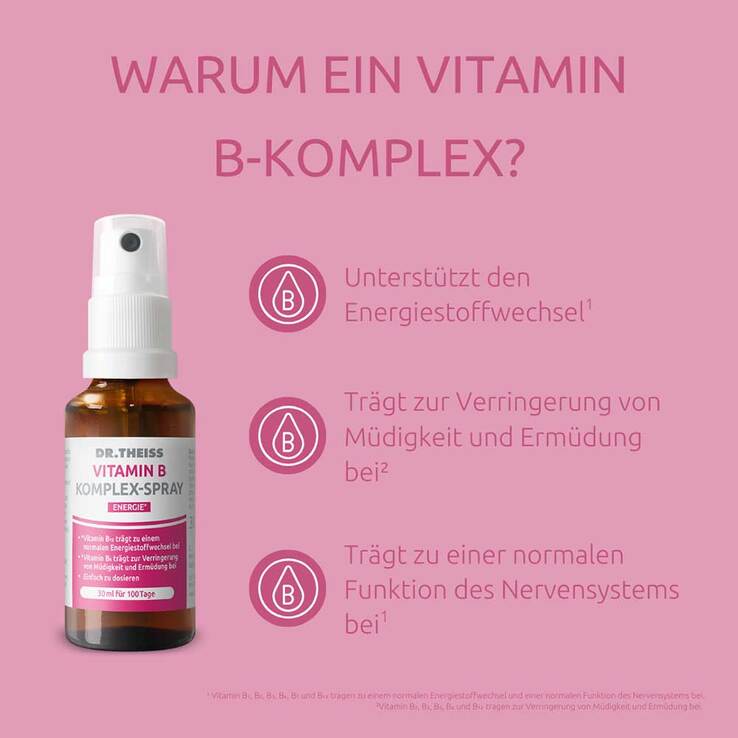 Das Dr. Theiss Vitamin B Komplex-Spray kombiniert gleich sieben B-Vitamine: B1, B2, B3, B5, B6, B7 (Biotin) und B12. Damit unterstützt es gezielt die tägliche Vitaminaufnahme – besonders dann, wenn es schnell und unkompliziert gehen soll.