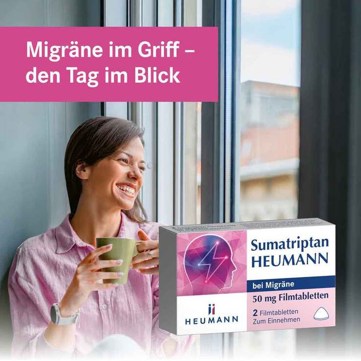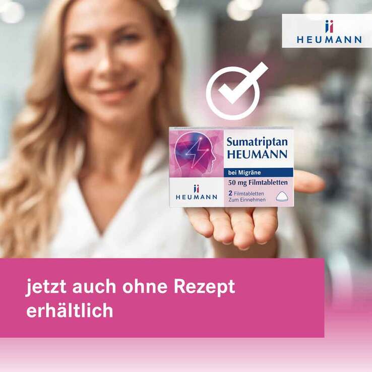Sumatriptan HEUMANN bei Migräne 50 mg Filmtabletten (Wirkstoff: Sumatriptan).Zur Anwendung bei Erwachsenen Anwendungsgebiete: Zur akuten Behandlung der Kopfschmerzphase bei Migräneanfällen mit und ohne Aura bei Erwachsenen, nach der Erstdiagnose einer Migräne durch einen Arzt. Warnhinweise: Dieses Arzneimittel ist nur für Patienten geeignet, die wissen, dass sie eine Migräne haben. Wenn Sie sich nicht sicher sind, ob Sie unter Migräne leiden, sprechen Sie mit Ihrem Arzt oder Apotheker. Typische Symptome einer Migräne sind: einseitig auftretende, hämmernde Kopfschmerzen; Übelkeit; Empfindlichkeit gegen Licht und Geräusche. Arzneimittel für Kinder unzugänglich aufbewahren. Enthält Lactose. Stand: 09/2025 Zu Risiken und Nebenwirkungen lesen Sie die Packungsbeilage und fragen Sie Ihre Ärztin, Ihren Arzt oder in Ihrer Apotheke