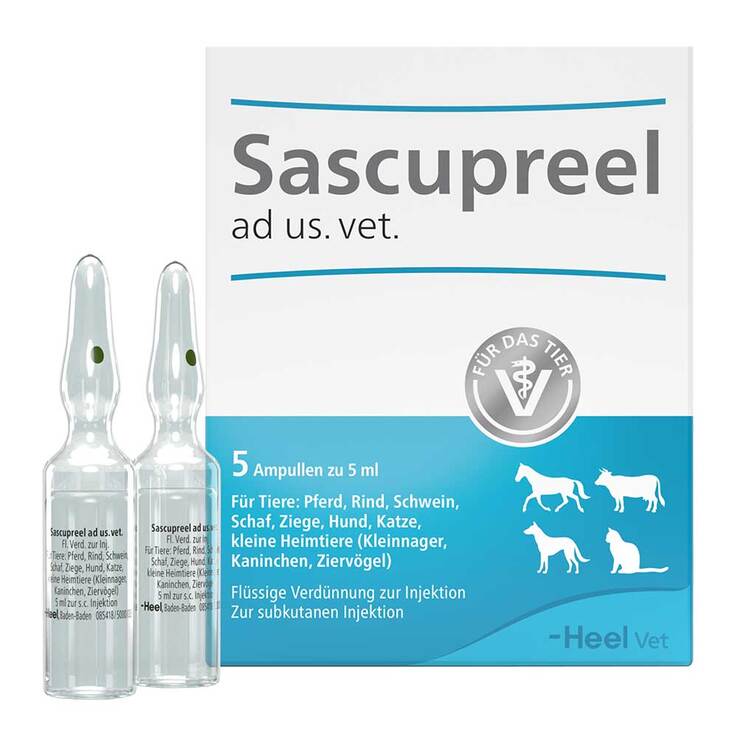 Pflichtangaben:Sascupreel ad us. vet. Ampullen Flüssige Verdünnung zur Injektion. Reg.-Nr.: 402473.00.00. Registriertes homöopathisches Arzneimittel, daher ohne Angabe einer therapeutischen Indikation. Wartezeit: Pferd, Rind, Schwein, Schaf, Ziege: Essbare Gewebe: Null Tage, Pferd, Rind, Schaf, Ziege: Milch: Null Stunden. Zu Risiken und Nebenwirkungen lesen Sie die Packungsbeilage und fragen Sie die Tierärztin, den Tierarzt oder in Ihrer Apotheke. Biologische Heilmittel Heel GmbH, 76532 Baden-Baden, Dezember 2023