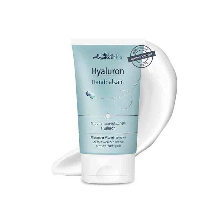 Der Hyaluron Handbalsam von medipharma cosmetics wurde speziell für die Bedürfnisse trockener und empfindlicher Haut entwickelt. Die vegane Formulierung enthält pharmazeutisches Hyaluron, Biotin, Vitamin A und Provitamin B5 – eine wirkungsvolle Kombination, die die Haut intensiv mit Feuchtigkeit versorgt, die Regeneration unterstützt und die Hautstruktur glätten kann. Auch spröde Nagelhaut wird gepflegt und geschmeidig gehalten.
