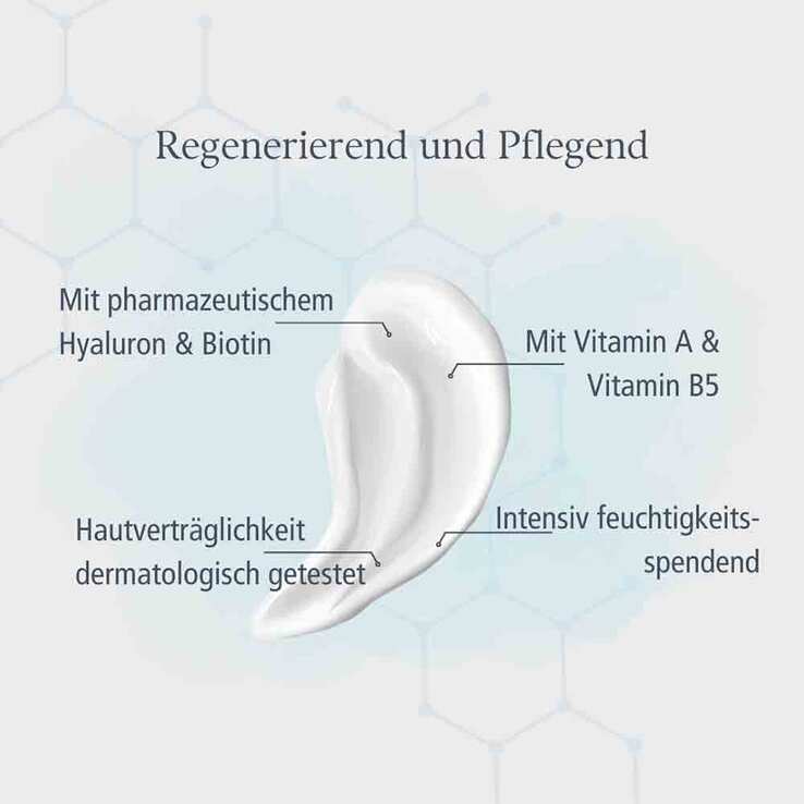 Regenerierende Pflege für trockene Hände – mit pharmazeutischem Hyaluron, Biotin, Vitamin A und Provitamin B5 für geschmeidige Haut und gepflegte Hände.