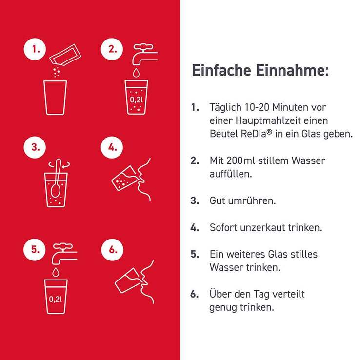 ReDia sollte immer mit reichlich Wasser eingenommen werden, damit das BallaststoffGranulat den Magen erreicht. Der pflanzliche Ballaststoff in ReDia bindet Flüssigkeit. Es empfiehlt sich, mindestens 1,5 Liter Flüssigkeit am Tag zu trinken.