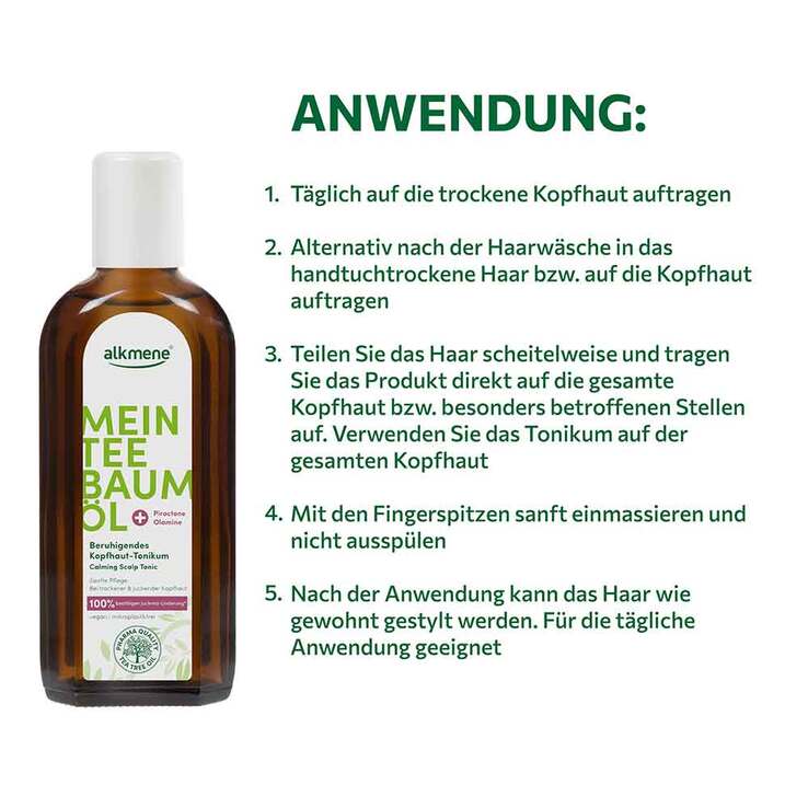 Das alkmene MEIN TEEBAUMÖL Beruhigendes Kopfhaut Tonikum mit der einzigartigen Wirkkombination aus Teebaumöl und Piroctone Olamine lindert nachweislich Kopfhautreizungen. Sie spendet Feuchtigkeit und beruhigt effektiv trockene, juckende und schuppige Kopfhaut.Hautverträglichkeit dermatologisch bestätigt.