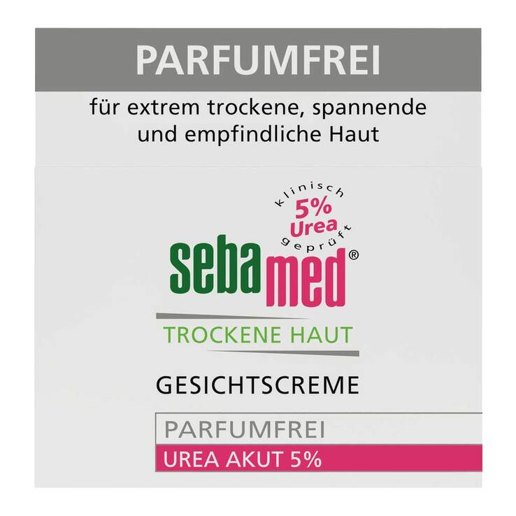 Die sebamed Trockene Haut Gesichtscreme Urea Akut 5% parfumfrei lindert spürbar Spannungsgefühl, Schuppung und Rauheit bei sehr trockener Haut.