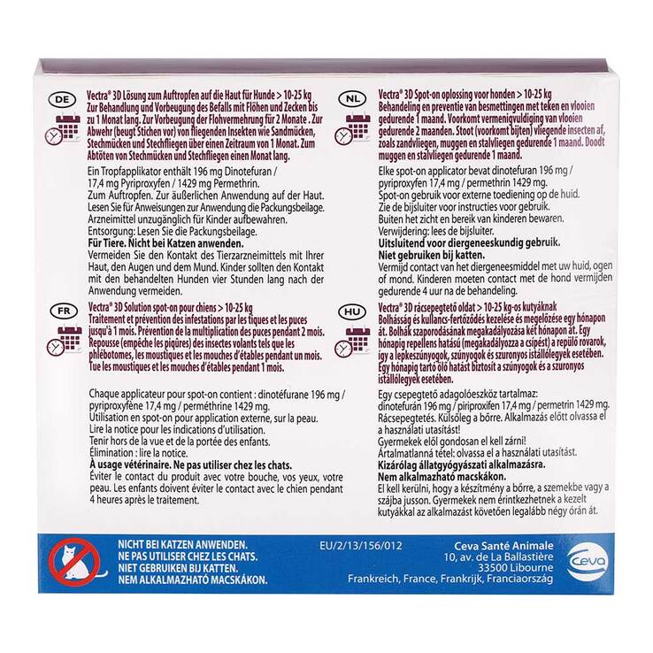Pflichtangaben:VECTRA 3D Lösung zum Auftropfen auf die Haut für Hunde. . Anwendungsgebiete: Flöhe: Zur Behandlung und Vorbeugung von Flohbefall (Ctenocephalides felis und Ctenocephalides canis). Die Behandlung schützt einen Monat lang vor Flohbefall und verhindert über einen Zeitraum von zwei Monaten nach der Anwendung die Vermehrung von Flöhen durch Hemmung des Eischlupfes (ovizide Wirkung) und durch Hemmung der Entwicklung erwachsener Flöhe aus Eiern, die von erwachsenen Flöhen gelegt werden (larvizide Wirkung). Zecken: Dieses Tierarzneimittel hat eine anhaltendabtötende (akarizide) und abwehrende (repellierende) Wirkung gegenüber Zecken (gegen Rhipicephalus sanguineus und Ixodes ricinus einen Monat lang und gegen Dermacentor reticulatus bis zu 3 Wochen). Liegt bereits ein Befall mit Zecken vor, wenn das Tierarzneimittel aufgetragen wird, werden möglicherweise nicht alle Zecken innerhalb der ersten 48 Stunden abgetötet, sondern innerhalb einer Woche. Es wird empfohlen, diese Zecken mit einem geeigneten Instrument zu entfernen. Sandmücken, Stechmücken und Stechfliegen: Die Behandlung hat eine anhaltend abwehrende (anti-feeding) Wirkung zur Folge. Sie beugt für die Dauer eines Monats nach Anwendung Stichen von Sandmücken (Phlebotomus perniciosus), Stechmücken (Culex pipiens, Aedes aegypti) und Stechfliegen (Stomoxyscalcitrans) vor. Die Behandlung hat auch eine einen Monat lang anhaltende abtötende (insektizide) Wirkung gegenüber Mücken (Aedes aegypti) und Stechfliegen (Stomoxys calcitrans). Warnhinweis: Nicht bei Katzen anwenden. Pharmazeutischer Unternehmer: Ceva Tiergesundheit GmbH, Düsseldorf. Vectra Felis 423 mg/42,3 mg Lösung zum Auftropfen auf die Haut für Katzen. Zur Behandlung und Vorbeugung von Flohbefall (Ctenocephalides felis) bei Katzen. Eine Behandlung schützt für einen Monat vor Flohbefall. Sie verhindert ebenfalls die Vermehrung von Flöhen durch Hemmung der Flohentwicklung in der Umgebung der Katze für einen Zeitraum von drei Monaten. Pharmazeutischer Unternehmer: Ceva Tiergesundheit GmbH, Düsseldorf. Zu Risiken und Nebenwirkungen lesen Sie die Packungsbeilage und fragen Sie den Tierarzt oder Apotheker. * bis zu 3 Wochen gegen die Zeckenart D. reticulatus