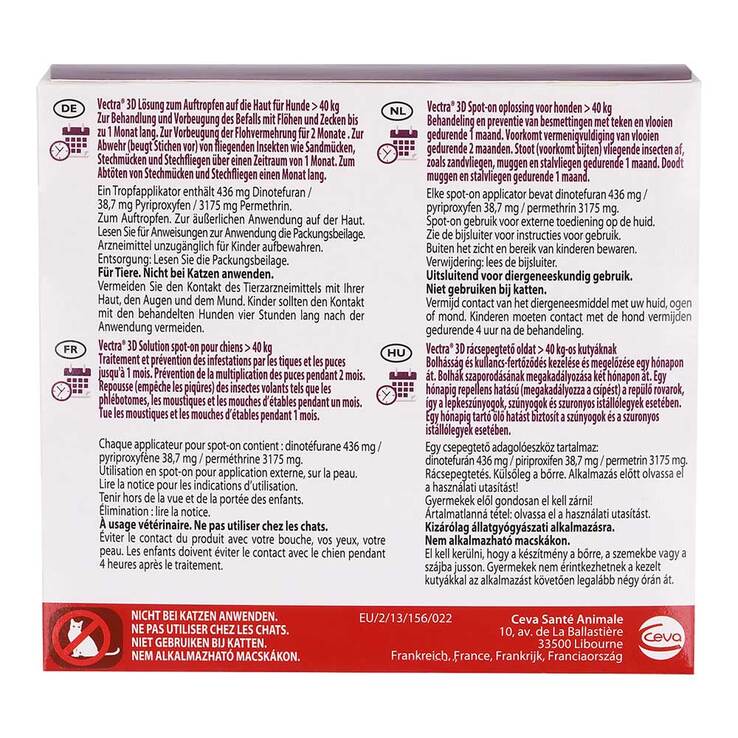 Pflichtangaben:VECTRA 3D Lösung zum Auftropfen auf die Haut für Hunde. . Anwendungsgebiete: Flöhe: Zur Behandlung und Vorbeugung von Flohbefall (Ctenocephalides felis und Ctenocephalides canis). Die Behandlung schützt einen Monat lang vor Flohbefall und verhindert über einen Zeitraum von zwei Monaten nach der Anwendung die Vermehrung von Flöhen durch Hemmung des Eischlupfes (ovizide Wirkung) und durch Hemmung der Entwicklung erwachsener Flöhe aus Eiern, die von erwachsenen Flöhen gelegt werden (larvizide Wirkung). Zecken: Dieses Tierarzneimittel hat eine anhaltendabtötende (akarizide) und abwehrende (repellierende) Wirkung gegenüber Zecken (gegen Rhipicephalus sanguineus und Ixodes ricinus einen Monat lang und gegen Dermacentor reticulatus bis zu 3 Wochen). Liegt bereits ein Befall mit Zecken vor, wenn das Tierarzneimittel aufgetragen wird, werden möglicherweise nicht alle Zecken innerhalb der ersten 48 Stunden abgetötet, sondern innerhalb einer Woche. Es wird empfohlen, diese Zecken mit einem geeigneten Instrument zu entfernen. Sandmücken, Stechmücken und Stechfliegen: Die Behandlung hat eine anhaltend abwehrende (anti-feeding) Wirkung zur Folge. Sie beugt für die Dauer eines Monats nach Anwendung Stichen von Sandmücken (Phlebotomus perniciosus), Stechmücken (Culex pipiens, Aedes aegypti) und Stechfliegen (Stomoxyscalcitrans) vor. Die Behandlung hat auch eine einen Monat lang anhaltende abtötende (insektizide) Wirkung gegenüber Mücken (Aedes aegypti) und Stechfliegen (Stomoxys calcitrans). Warnhinweis: Nicht bei Katzen anwenden. Pharmazeutischer Unternehmer: Ceva Tiergesundheit GmbH, Düsseldorf. Vectra Felis 423 mg/42,3 mg Lösung zum Auftropfen auf die Haut für Katzen. Zur Behandlung und Vorbeugung von Flohbefall (Ctenocephalides felis) bei Katzen. Eine Behandlung schützt für einen Monat vor Flohbefall. Sie verhindert ebenfalls die Vermehrung von Flöhen durch Hemmung der Flohentwicklung in der Umgebung der Katze für einen Zeitraum von drei Monaten. Pharmazeutischer Unternehmer: Ceva Tiergesundheit GmbH, Düsseldorf. Zu Risiken und Nebenwirkungen lesen Sie die Packungsbeilage und fragen Sie den Tierarzt oder Apotheker. * bis zu 3 Wochen gegen die Zeckenart D. reticulatus