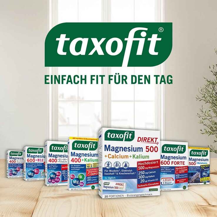 Körperlich aktive Menschen können durch einen verstärkten Muskelaufbau und höheren Energieverbrauch einen erhöhten Bedarf an Vitaminen und Mineralstoffen haben. taxofit® Magnesium 500 + Calcium + Kalium DIREKT enthält daher ausgewählte Mikronährstoffe zur Unterstützung der Muskelfunktion, des Elektrolythaushaltes, der Erhaltung normaler Knochen und des Energiestoffwechsels.* Das Direkt Granulat ermöglicht eine schnelle Aufnahme und ist leicht einzunehmen. Besonders praktisch für unterwegs und ganze ohne Wasser.