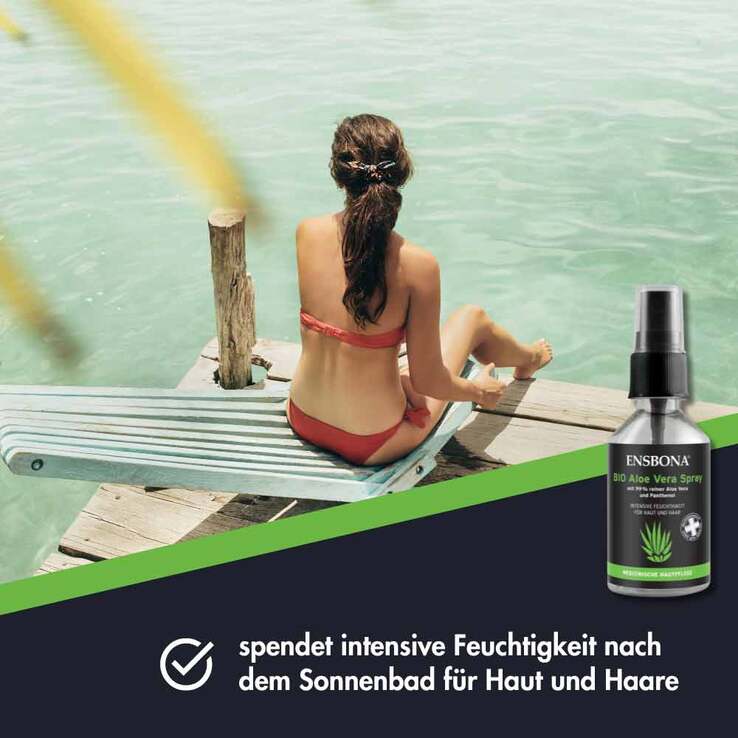 Ensbona Bio Aloe Vera Spray enthält natürlichen Blattsaft der Aloe Vera Pflanze aus kontrolliert biologischem Anbau. Es ist angenehm kühlend und versorgt Haut und Haar mit intensiver Feuchtigkeit. Das Spray enthält zusätzlich Panthenol und ist dadurch besonders hautberuhigend und angenehm bei gereizter Haut und Kopfhaut. Eine Verwendung nach dem Sonnenbad ist ideal, das Spray eignet sich auch für schwer erreichbare Stellen. Ensbona Bio Aloe Vera Spray zieht schnell ein.