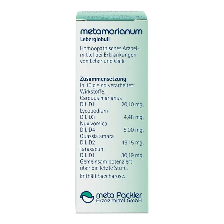 metamarianum Leberglobuli Die Anwendungsgebiete leiten sich von den homöopathischen Arzneimittelbildern ab. Dazu gehören: Erkrankungen von Leber und Galle. Enthält Saccharose. Zu Risiken und Nebenwirkungen lesen Sie die Packungsbeilage und fragen Sie Ihre Ärztin, Ihren Arzt oder in Ihrer Apotheke. meta Fackler Arzneimittel GmbH, D-31832 Springe