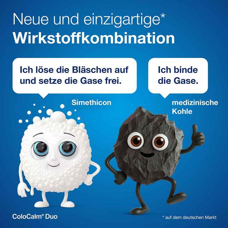 ColoCalm® Duo ist ein Medizinprodukt, das zur Linderung der Symptome von Blähungen und Flatulenz aufgrund der Ansammlung von Gasen beiträgt. ColoCalm® Duo wirkt gegen Krämpfe und damit verbundene Schmerzen und vermindert Flatulenz und Blähungen.