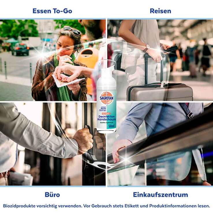 Unterwegs kommen unsere Hände mit besonders vielen Keimen und Bakterien in Berührung, gründliche Hand-Hygiene ist dann oft nötig, doch nicht immer möglich. Hierfür bietet der antibakterielle Sagrotan® Handschaum eine hygienische und effektive Desinfektion der Hände - auch ohne Wasser und ohne zu kleben.