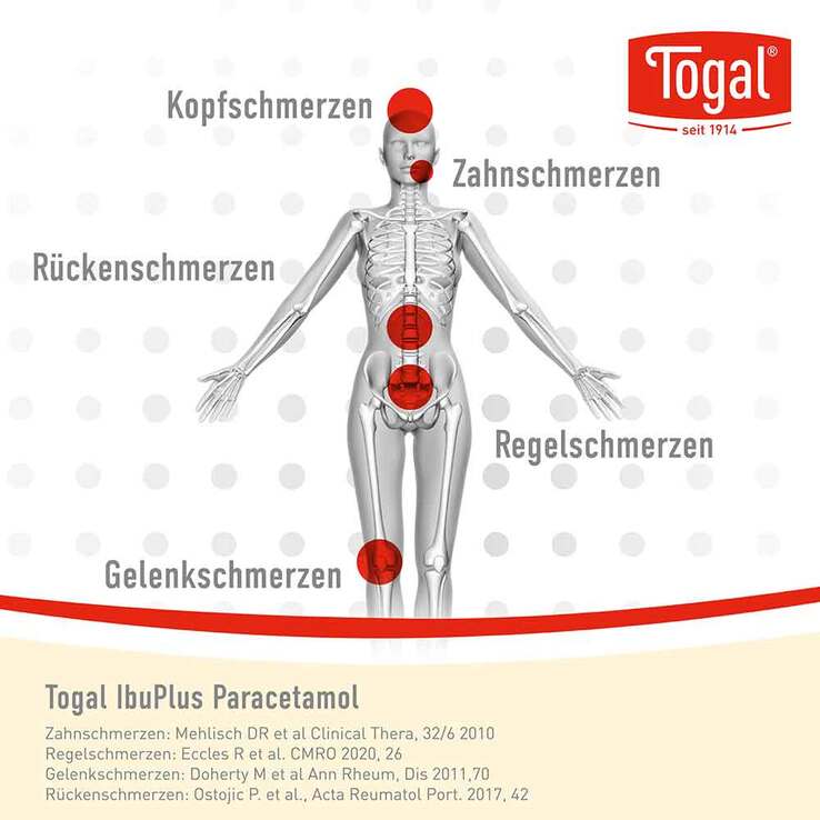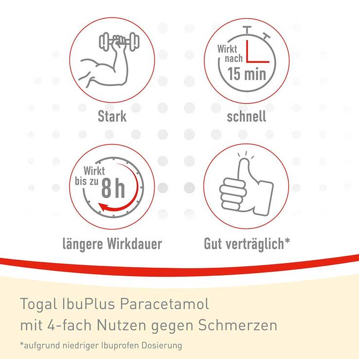 Togal IbuPlus Paracetamol 200 mg/500 mg Filmtabletten. Anwendungsgebiete: Zur kurzzeitigen symptomatischen Behandlung von leichten bis mäßig starken Schmerzen. Speziell anwendbar bei Schmerzen, die durch alleinige Anwendung von Ibuprofen oder Paracetamol nicht gelindert werden können. Warnhinweise: Arzneimittel für Kinder unzugänglich aufbewahren. Enthält Paracetamol. Nicht zusammen mit anderen Paracetamol-haltigen Arzneimitteln einnehmen. Nicht einnehmen, wenn Sie unter 18 Jahre alt sind. Überschreiten Sie nicht die angegebene Dosis. Im Falle einer Überdosierung sollte wegen des Risikos einer irreversiblen Leberschädigung unverzüglich ärztlicher Rat eingeholt werden. Wenn sich Ihre Symptome nach 3 Tagen nicht bessern, wenn sie sich verschlimmern oder wenn neue Symptome auftreten, wenden Sie sich an Ihren Arzt. Ohne ärztlichen Rat nicht länger anwenden als in der Packungsbeilage vorgegeben! Zu Risiken und Nebenwirkungen lesen Sie die Packungsbeilage und fragen Sie Ihre Ärztin, Ihren Arzt oder in Ihrer Apotheke. Stand: 08/2025