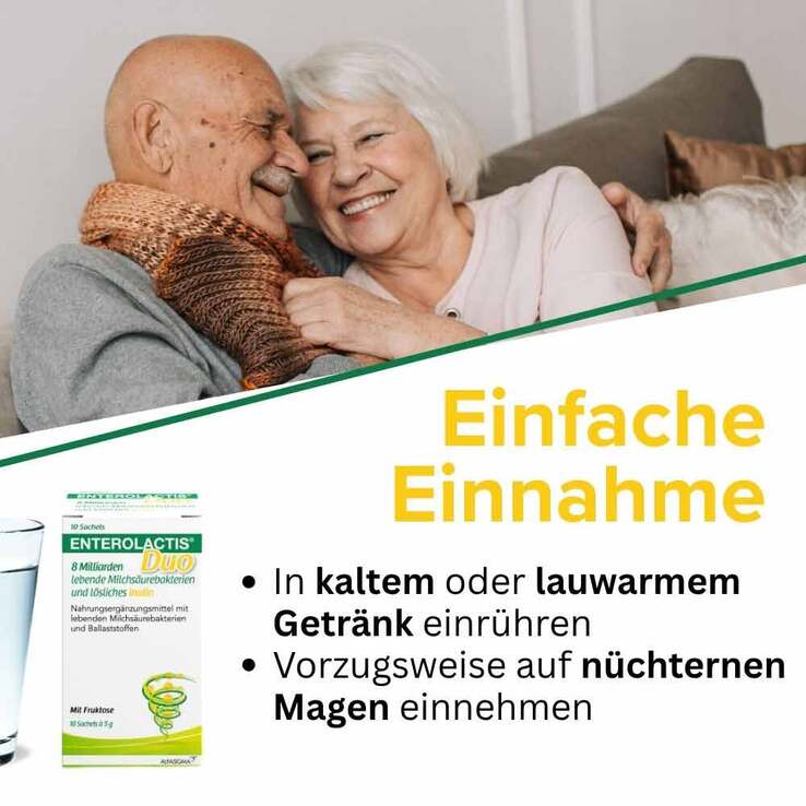 Ich bin über Enterolactis duo positiv überrascht. ...Man kann die Sachets einfach in ein Glas Wasser oder Saft geben und trinken.