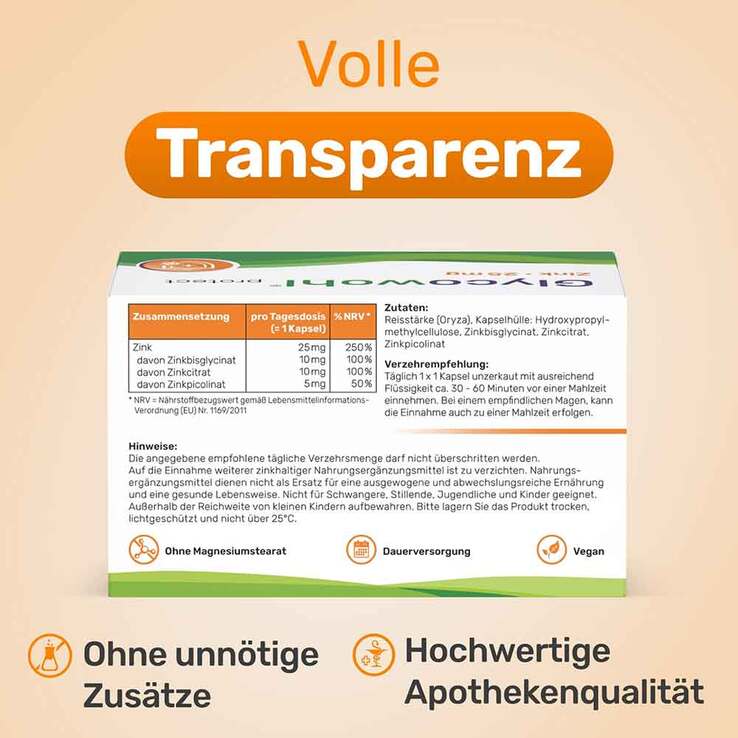 Die angegebene empfohlene tägliche Verzehrsmenge darf nicht überschritten werden. Auf die Einnahme weiterer zinkhaltiger Nahrungsergänzungsmittel ist zu verzichten. Nahrungsergänzungsmittel dienen nicht als Ersatz für eine ausgewogene und abwechslungsreiche Ernährung und eine gesunde Lebensweise.