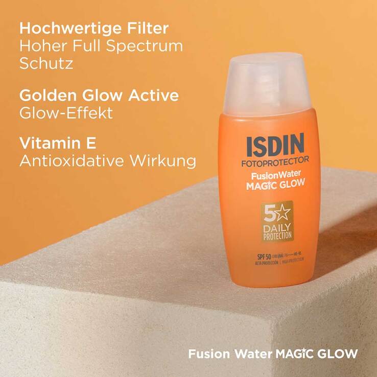 ISDIN Fotoprotector Fusion Water Magic glow LSF 50 ist hypoallergen und dermatologisch getestet, somit ideal für empfindliche und fettige Haut.