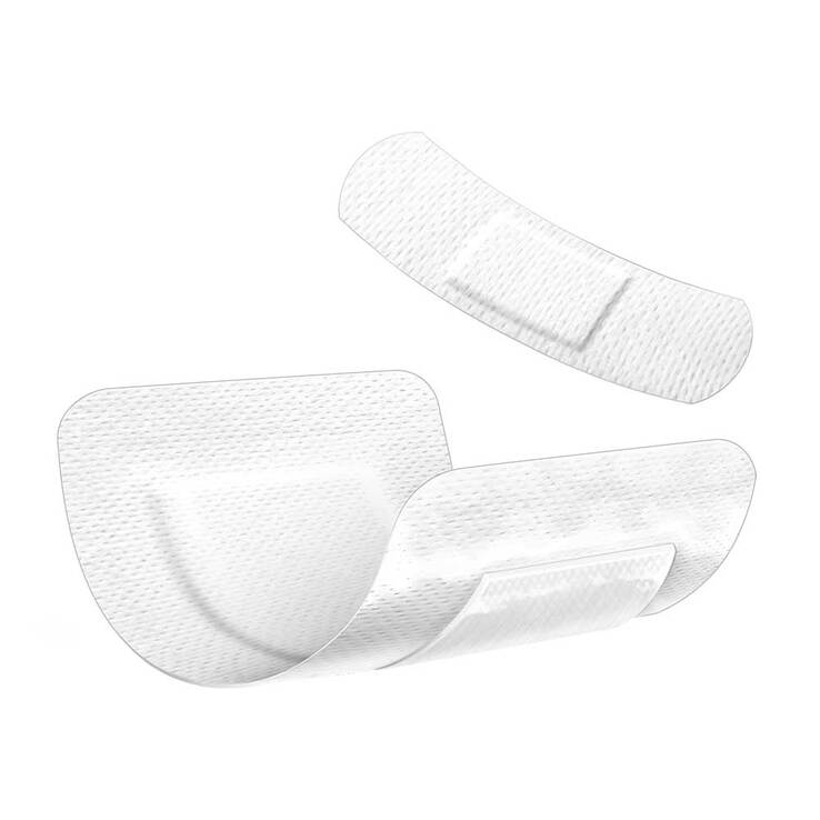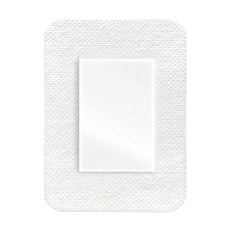 Trägermaterial:: weißer Spunlace-Vliesstoff, mit Silikonkleber beschichtet Wundkissen:: 40 % Viskose, 60 % Polyester