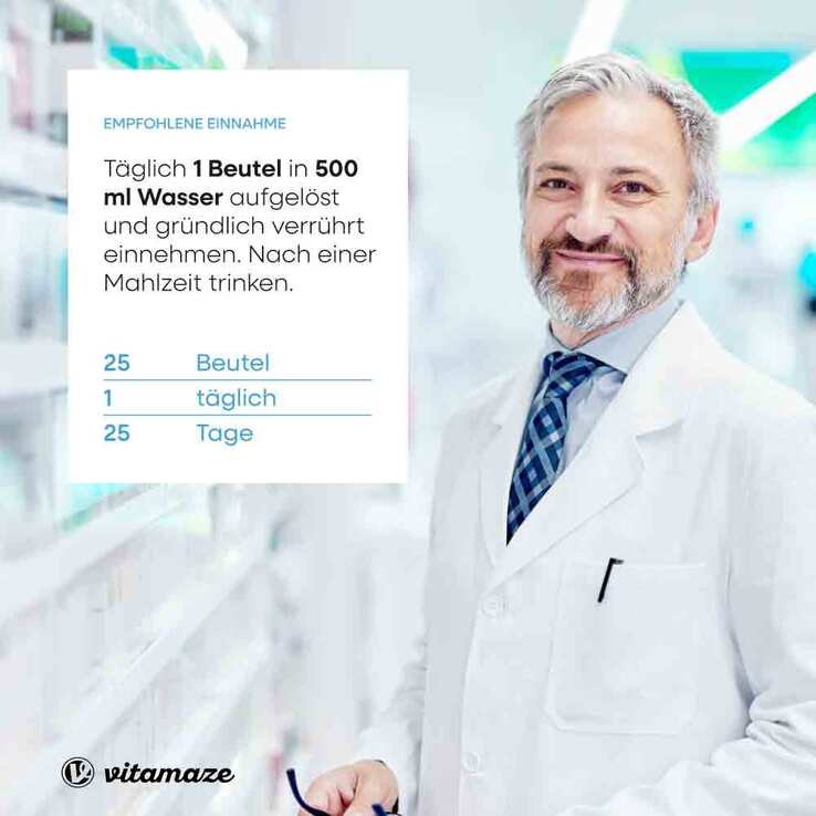 Täglich 1 Beutel in 500 ml Wasser aufgelöst und gründlich verrührt einnehmen. Nach einer Mahlzeit trinken.
