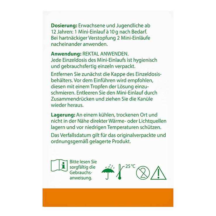 Erwachsene und Jugendliche ab 12 Jahren: 1 Mini-Einlauf à 10 g nach Bedarf rektal anwenden. Bei hartnäckiger Verstopfung 2 Mini-Einläufe nacheinander anwenden.