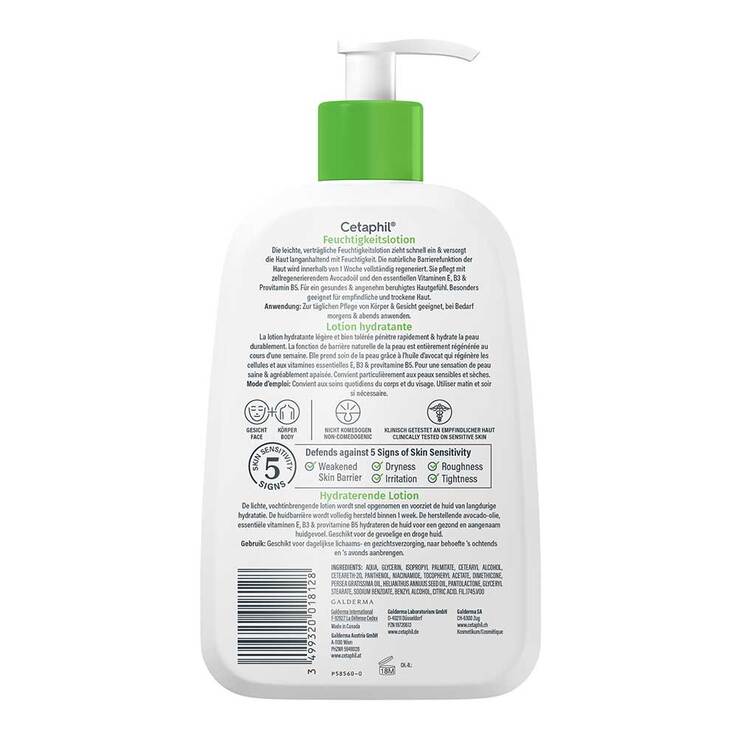 Die Cetaphil Feuchtigkeitslotion ist eine Emulsion aus Öl und Wasser (O/W-Emulsion). Das bedeutet, dass feinste Öltröpfchen in der Wasserbasis der Feuchtigkeitslotion verteilt sind. Dadurch wird Ihre Haut beim Eincremen angenehm erfrischt und die Lotion kann schnell einziehen. Die pflegende Wirkung wird u.a. durch hochwertiges Avocadoöl bewirkt. Zusätzlich zur Unterstützung natürlicher Feuchtigkeit auf der Haut wirken Glycerin und ProVitamin B5 (Dexpanthenol) in der Cetaphil Feuchtigkeitslotion hydratisierend und unterstützen den Hautstoffwechsel.