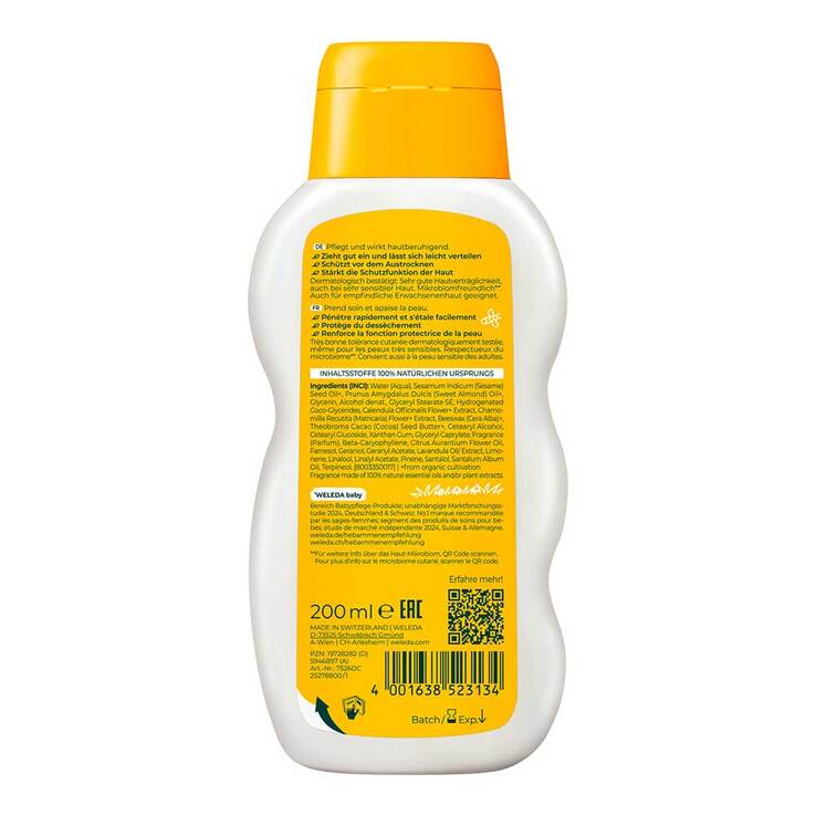 Die Weleda Calendula Pflegecreme Körper & Gesicht ist ideal für die tägliche Körperpflege von Babys und Kindern. Die reichhaltige Pflegecreme mit sorgfältig ausgewählten Natursubstanzen schützt zarte Haut und hält sie samtig weich. Ein wertvoller Auszug aus Bio-Calendula beruhigt die Haut; hautverwandtes Wollwachs bildet einen zuverlässigen Schutz vor dem Austrocknen. Die mild duftende Creme eignet sich auch sehr gut für die Pflege trockener Hautstellen.