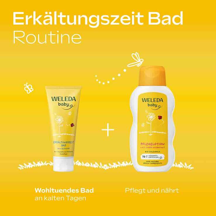 Schenken Sie Ihrem Baby in der kälteren Jahreszeit wohlige Geborgenheit mit dem Calendula Erkältungszeit Bad von Weleda Baby! Das Baden mit dem Erkältungszeit Bad entspannt und pflegt die Haut – seine extra milde Formel reinigt die Haut besonders sanft. Im durchwärmenden Bad entfaltet die Mischung mit Thymian, Latschenkiefer und Lavendel ihren angenehmen Duft. Das Bad ist geeignet für Babys ab 3 Monaten.