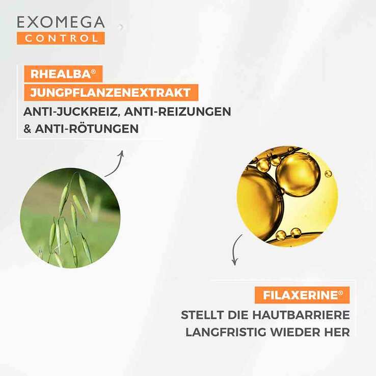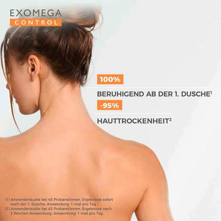Tragen Sie anschließend Ihr liebstes Produkt aus der EXOMEGA Pflegeserie auf die feuchte Haut auf, wie EXOMEGA Control Rückfettende Milch oder EXOMEGA Control Rückfettender Balsam.