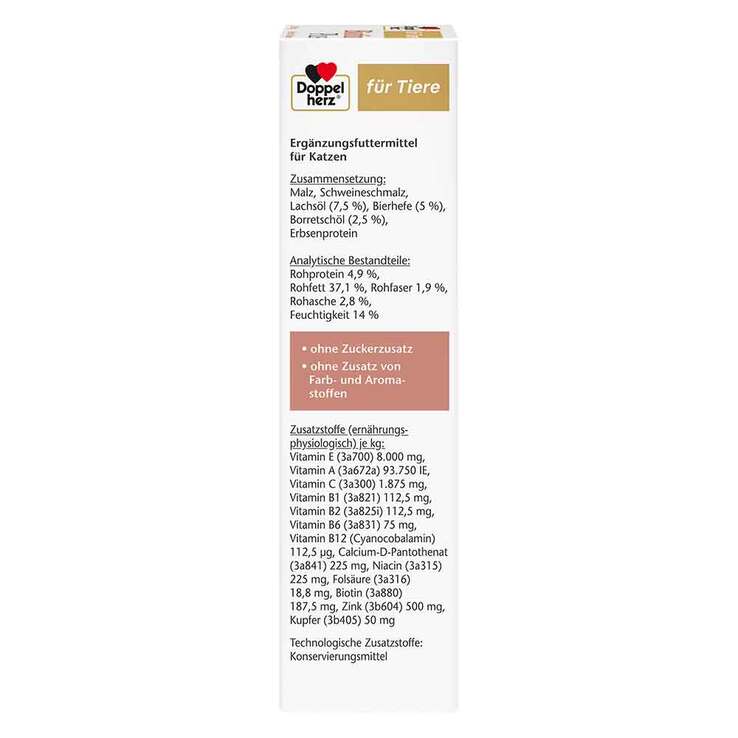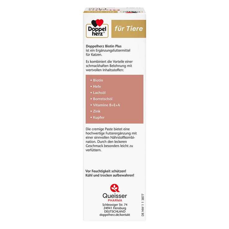 Die Höchstmenge von 10 % der täglichen Gesamtration sollte aufgrund des erhöhten Zink- und Kupfergehaltes nicht überschritten werden. Füttern Sie Doppelherz Biotin Plus Ihrer Katze direkt aus der Tube, pur in den Napf oder als Zugabe über das tägliche Futter.