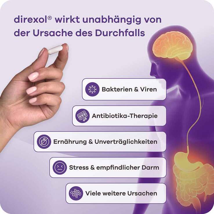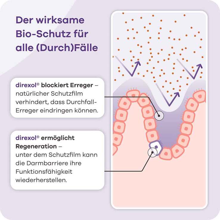 Direxol ist ein Medizinprodukt aus Xyloglucan und Gelose. Diese Kombination wirkt durch die Bildung eines Films zum Schutz der Darmschleimhaut und verringert so die Häufigkeit und Dauer von Durchfallerkrankungen. Es reduziert Symptome bei Durchfallerkrankungen unterschiedlicher Ursache, wie z.B. häufig flüssiger oder weicher Stuhlgang und abdominale Beschwerden. Die therapeutische Wirkung des Produktes setzt ca. 6 Stunden nach der Einnahme ein.
